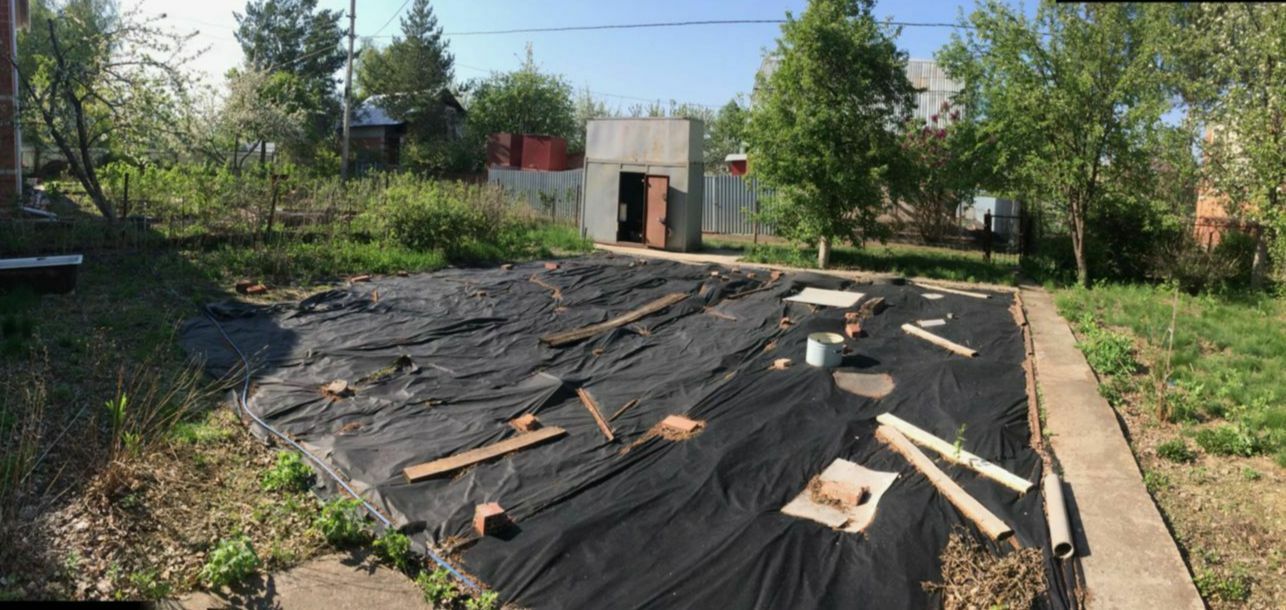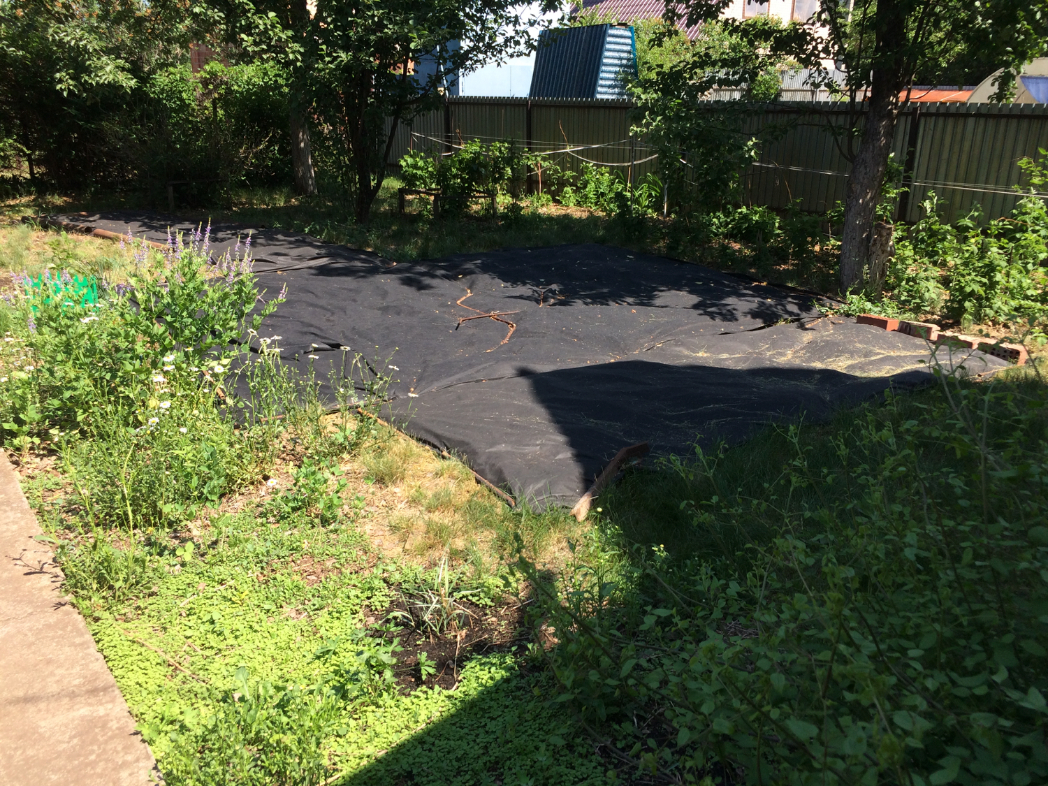 Купила на Авито мощную газонокосилку и скосила бурьян. С мужем, который приехал на помощь, накрыли пустующую землю черным спанбородом до весны.